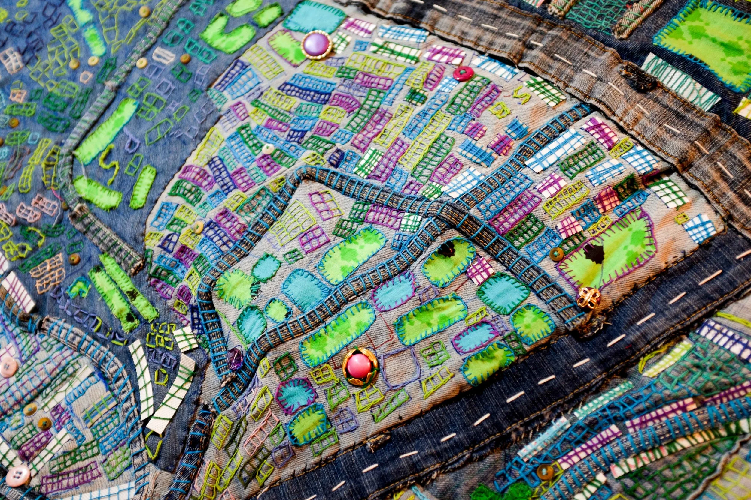 The structured yet informal nature of the Artboxes ensured that learning became a two-way process. The aspect of art as therapy was vital to the programme. A work that spoke of violence against women in public spaces was visualised as a large map of Dharavi and recreated as a quilt, hand-stitched from offcuts of jeans, sourced locally. The danger zones, denoted by 'X' were plastic-wrapped bottle caps. With zippers to indicate railway tracks, buttons and applique work, the installation titled Mapping the Hurt highlighted the issue effectively. Created by a team of over thirty participants, the artwork was mentored by textile designer and fabric artist Susie Vickery.