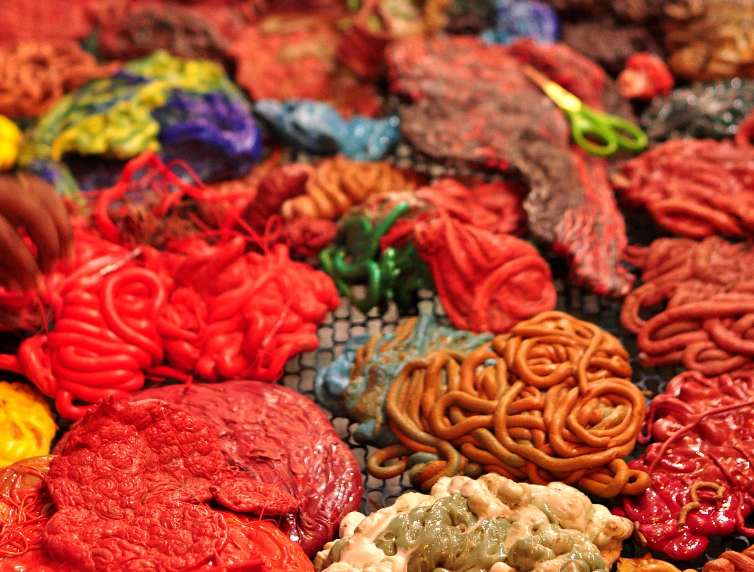 The Immunity Wall is an abstraction of the human body’s vigorous germ-fighting system and draws on electron micrograph images of immune cells. It illustrates our defences against microbes and foreign bodies and calls to mind the archetypal fight between good and evil. Despite the seemingly sober nature of the immune system’s handling of germs, the piece is a vivid assembly of pieces of extruded plastic. These gobbets are a common find in recycling units in Dharavi's Sanaullah Compound, and their brain-like formations and glossy coating make some people queasy and others curious. At Dharavi workplaces, the vibrant blobs are shredded into particles for repurposing by larger factories. The Immunity Wall recycles the plastic along with the old bed to discuss the way in which the body renews its immune system constantly to keep itself healthy.